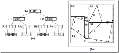 Figure 16.7 is an example of one possible R+-tree for the collection of line segments in Figure 16.5. This particular tree is of order (2,3) although in general it is not possible to guarantee that all nodes will always have a minimum of 2 entries. In particular, the expected B-tree performance guarantees are not valid (i.e., pages are not guaranteed to be m/M full) unless we are willing to perform very complicated record insertion and deletion procedures. Notice that line segment objects c, h, and i appear in two different nodes. Of course, other variants are possible since the R+-tree is not unique.