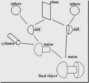 From a data structure and algorithm standpoint, CSG trees are quite useful. Firstly, and most obvious, the method utilizes the tree structure already mentioned throughout the text. Secondly, the final objects do not require individual mesh models to define them. Rather, each object is simply defined by its tree, where each node of the tree references primitives, such as the sphere, cone, cylinder, cube, and plane. With the basic models for the sphere, cone, etc. preprocessed and stored in memory, the overhead of CSG applications is kept to a minimum.