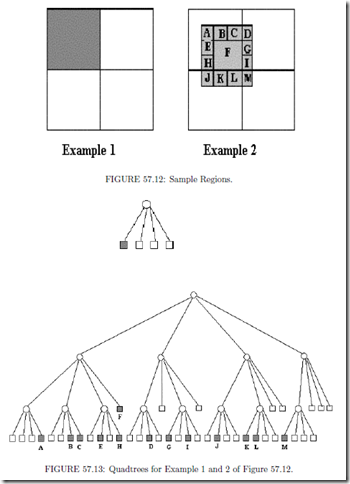 translated from its original position, can have a very different looking structure [22]. We explain this phenomenon by using the example given in Figure 57.12. In Example 1, the black square is in the upper left corner. In Example 2, it is translated down and right by one pixel. Figure 57.13 gives the quadtree representation for these two examples.